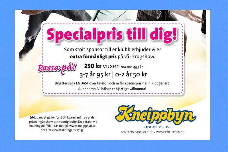 Hej alla IFK-are! Här kommer et härligt medlemserbjudande från Kneippbyn Resort Visby Missa inte det 😉 "På mångas efterfrågan kör vi nu en IFK-vecka, Hela vecka 30 erbjuder vi IFK Visby medlemmar att köpa krogshowbiljetter till halva priset. (Pris 250 kr/vuxen, ordinarie 495 kr/vuxen). Rabatten gäller vuxenbiljetter, valfri krogshow vecka 30, mån 23/7, ons 25/7, fre 27/7. Gäller endast köp av nya biljetter och i mån av plats. Biljetter bokas i receptionen eller på telefon (bokning), kod som skall uppges för att man skall erhålla rabatt är IFK. Varmt välkomna Hälsar Bobbo och Anja med personal"