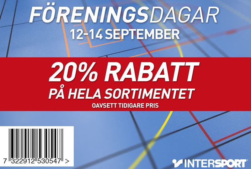 Tillsammans med Intersport bjuder vi in dig till föreningsdagar 12-14 september. Få 20% rabatt på hela sortimentet oavsett tidigare pris. Ett perfekt tillfälle att köpa skor, kläder och utrustning till specialpris! *Gäller ej cykel, presentkort, beställningsvaror eller föreningsprofiler. Visa upp denna inbjudan i kassan för att få rabatten - Klicka här för att ladda ned inbjudan-> Välkommen!